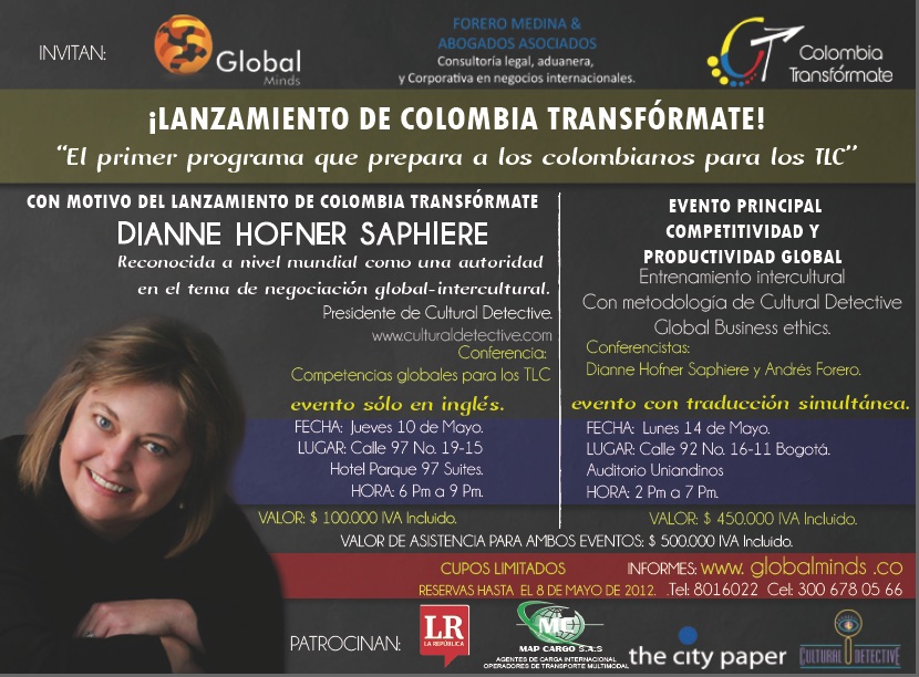We will hold a high-energy event designed to ready Colombians to reap the benefits of their recent Free Trade Agreements with Canada and the USA, and upcoming agreements with the European Union and South Korea. Anyone wishing to improve their cross-cultural business acumen will find attendance extremely valuable. We believe this is one of the first-ever public workshops on intercultural communication in Colombia. The workshop will be facilitated by Fernando Parrado of Global Minds, Andrés Forero of the Forero Medina Abogados Asociados, and Dianne Hofner Saphiere of Cultural Detective.