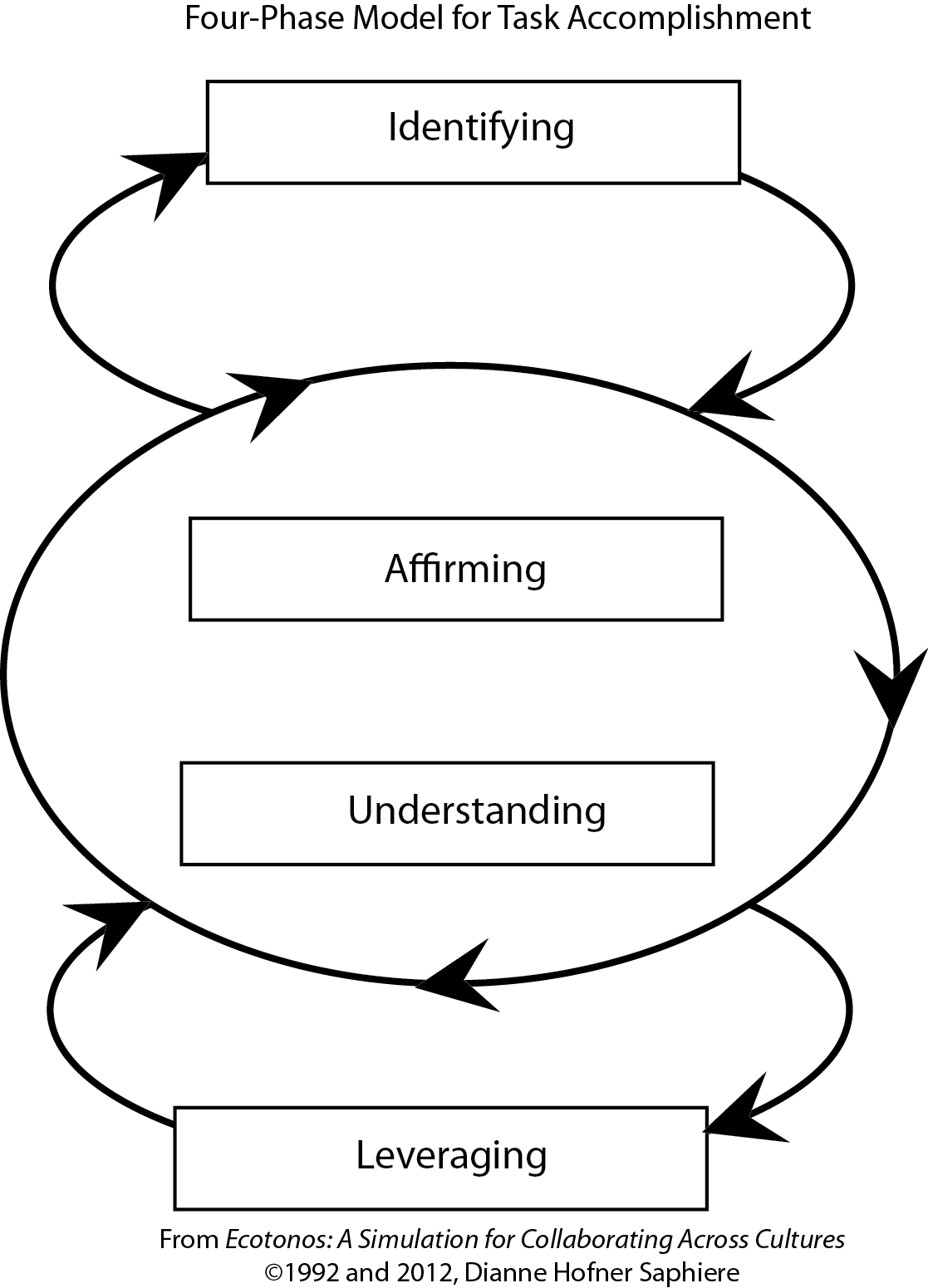 One model that has proven quite useful over the past two decades of use comes from the classic and widely used simulation, Ecotonos: A Simulation for Collaborating Across Cultures. Called the “Four-Phase Model for Task Accomplishment,” this very simple approach guides us to first identify the similarities and differences at play in our interaction, verbally affirm them, spend time understanding them and, finally, explore how to leverage them.