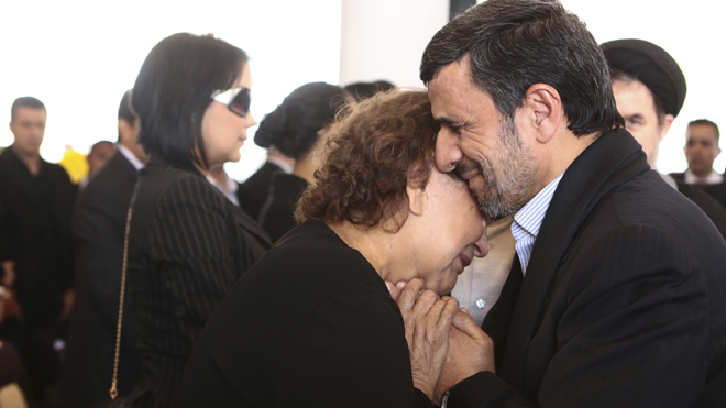 Mahmoud Ahmadinejad, Elena FriasKeep looking at the photo above. In case you do not already know, the photo was taken at the funeral of Venezuela’s President Hugo Chavez in March 2013. On the left is Chavez’s mother, Elena Frias de Chavez, and on the right is Iran’s President Ahmadinejad. Now, pause and take a few more notes on what you see in the photo.