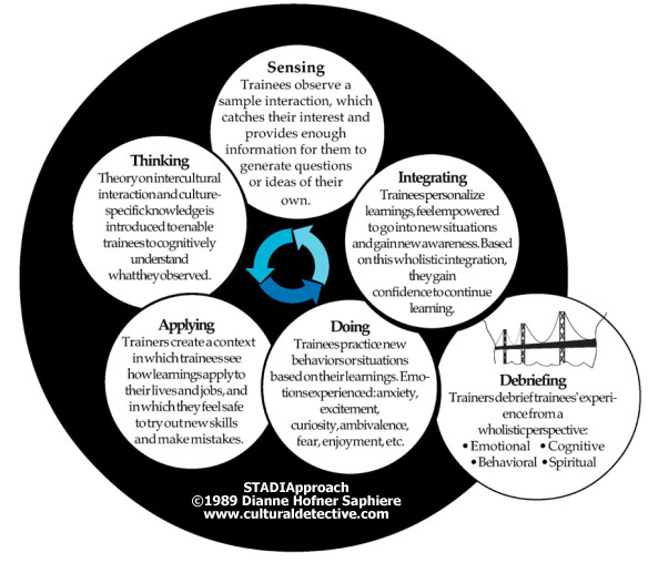 This “oldie but goodie,” the STADIApproach to Intercultural Learning, has been used in dozens of organizations worldwide with huge success. Click on the link to view a full article on the approach. I first published it for use with my proprietary clients in 1989; it is now even more useful as it can provide a design framework for blended learning approaches that leverage Cultural Detective Online. The CD Online system has STADI embedded into its core. In the hands of a skilled facilitator, teacher or coach, you can assist your learners to Sense, Think, Apply, Do and Integrate by analyzing the experience of others via the critical incidents in CD Online, as well as probing their own real life experiences.