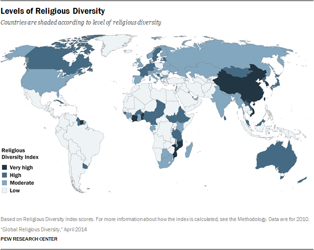 socialHostilitiesJust this month, April 4, 2014, the Pew-Templeton Global Religious Futures project, which analyzes religious change and its impact on societies around the world, published further analysis that it conducted on the 2010 data. They produced a very interesting index that ranks each country by its level of religious diversity—its RDI, or “Religious Diversity Index.” RDI was calculated based on the percentage of each country’s population that belongs to the eight major religious groups defined by Pew. The closer a country comes to having equal shares of the eight groups, the higher its score on the 10-point index.
