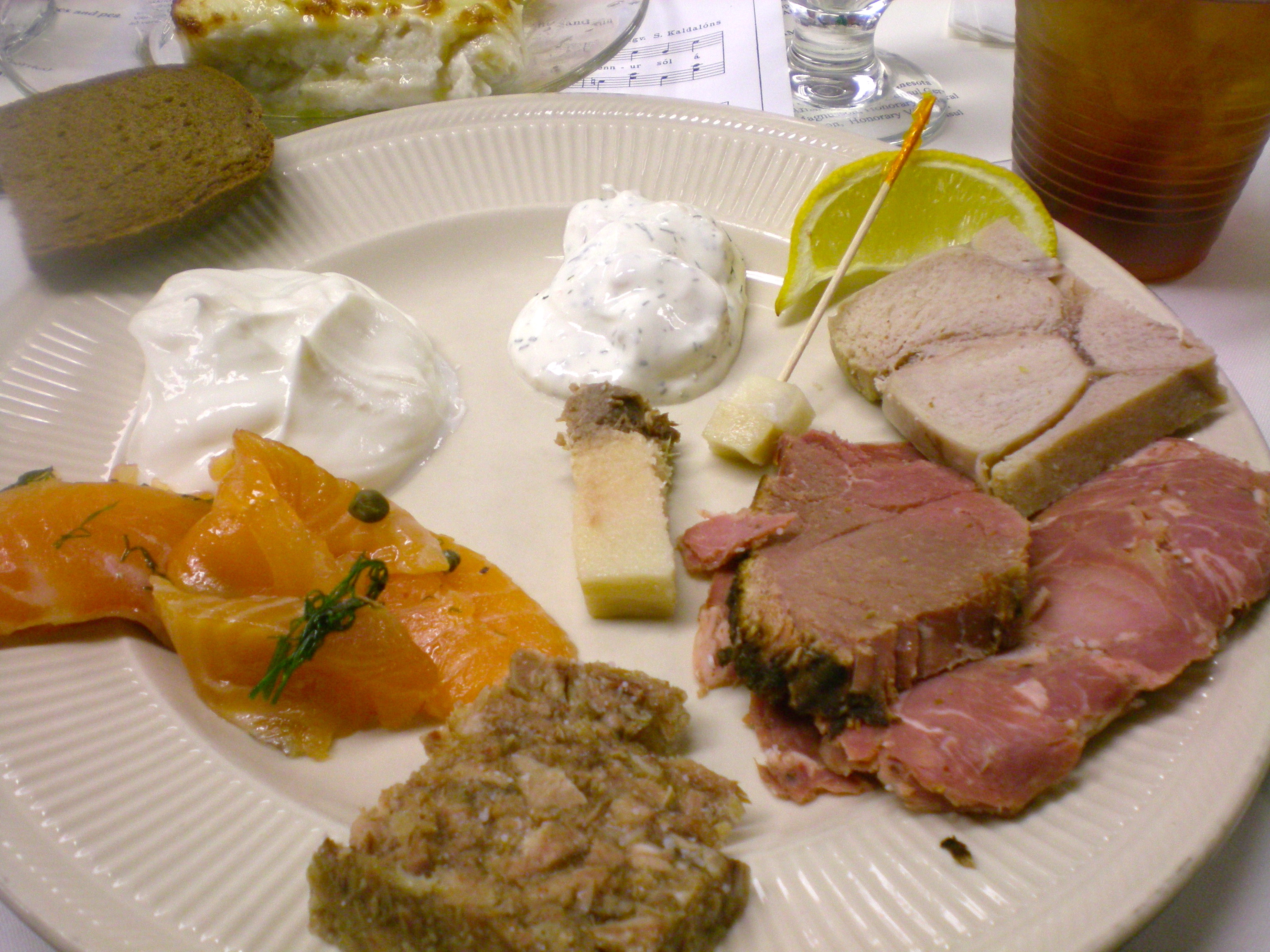 These parties are usually attended by people belonging to the same social group such as a fireman’s association, an association of people from a particular fjord, or people who work for the same company, etc. The entertainment varies from a stage performance, to a comedian as Master of Ceremonies, to people making speeches and reciting Icelandic poetry, and usually ends with lots of dancing and singing of national songs. The staple foods at these parties are pickled ram’s testicles, boiled sheep’s head, blood sausages, liver pudding, smoked and cured lamb, and dried fish. Some people have to be “manned” into eating these things, and some parties have these delicacies as side dishes rather than as the main dishes.